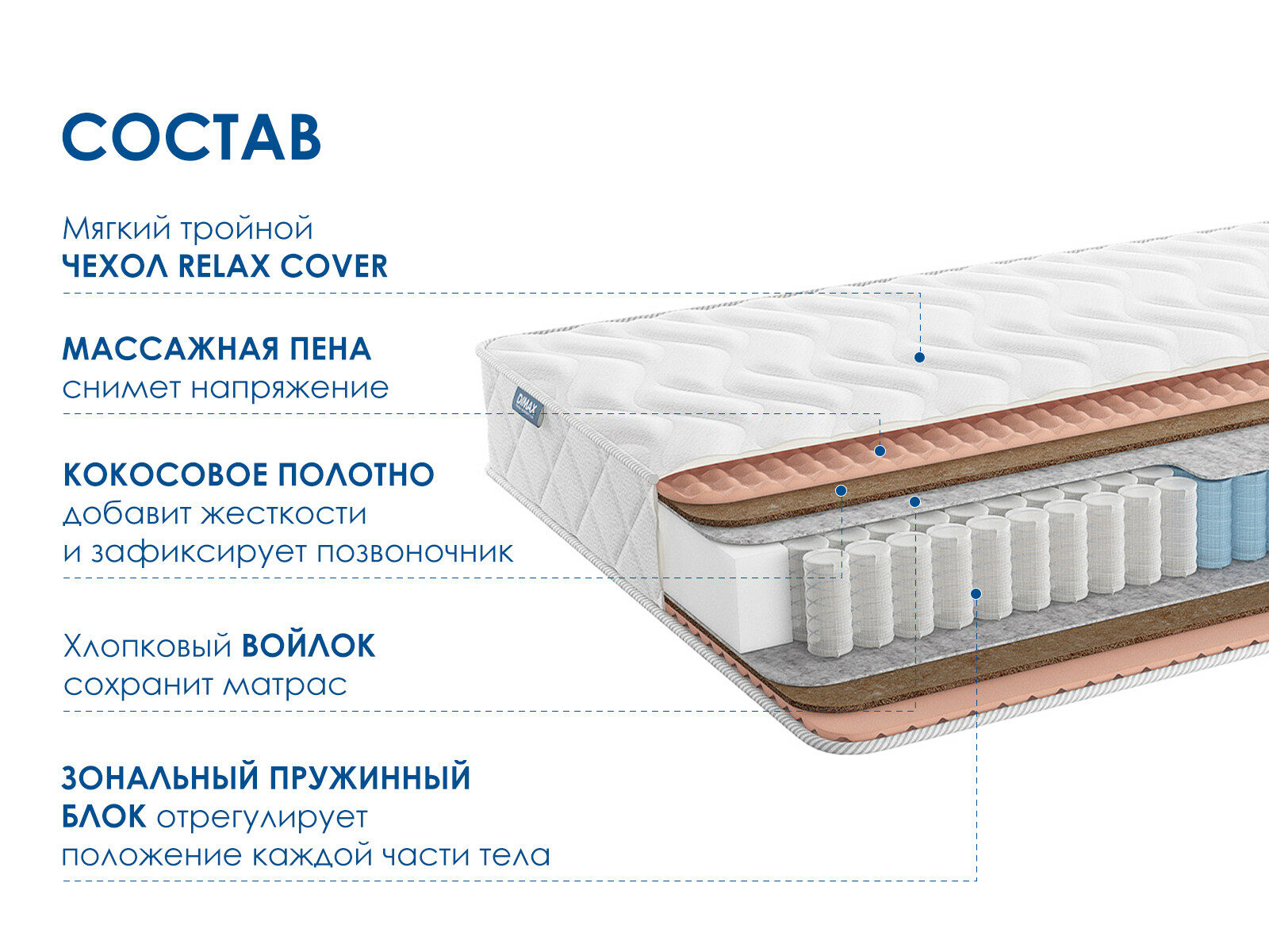 Димакс Relmas Cocos 3Zone – ортопедический матрас с эффектом массажа и жёсткостью сторон выше среднего уровня. Благодаря натуральному наполнению и уникальному пружинному блоку с трёхзональной поддержкой, модель создаёт идеальные условия для отдыха и расслабления мышц.