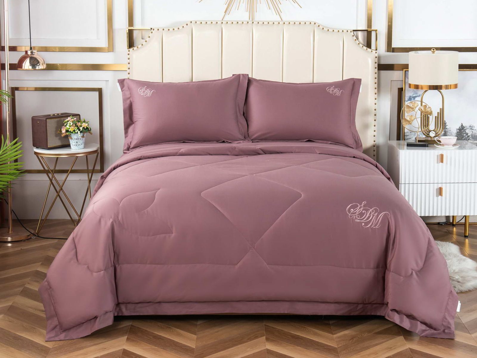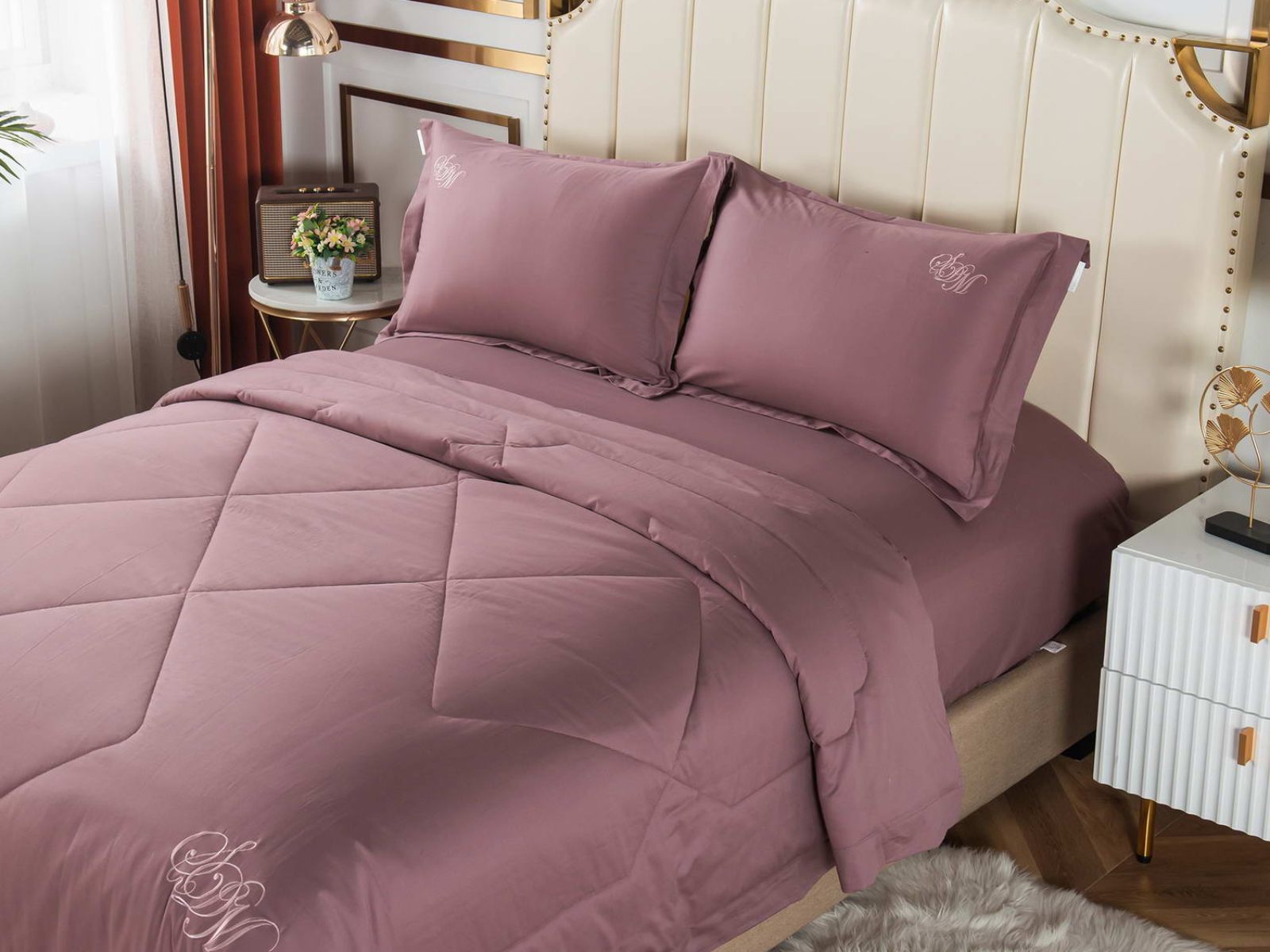 В комплект входят простыня, наволочки и одеяло. Одеяло простеганное, легкое и воздушное, его можно стирать в стиральной машине. Благодаря микроволокну в составе наполнителя для одеяла, оно всегда принимает свою начальную форму.