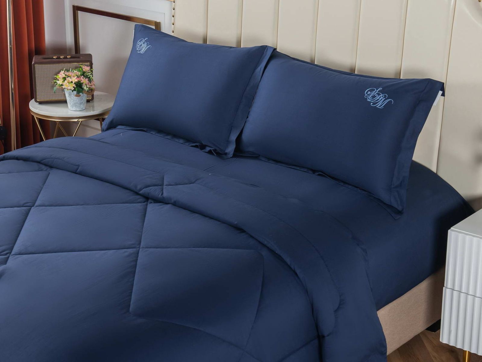 В комплект входят простыня, наволочки и одеяло. Одеяло простеганное, легкое и воздушное, его можно стирать в стиральной машине. Благодаря микроволокну в составе наполнителя для одеяла, оно всегда принимает свою начальную форму.