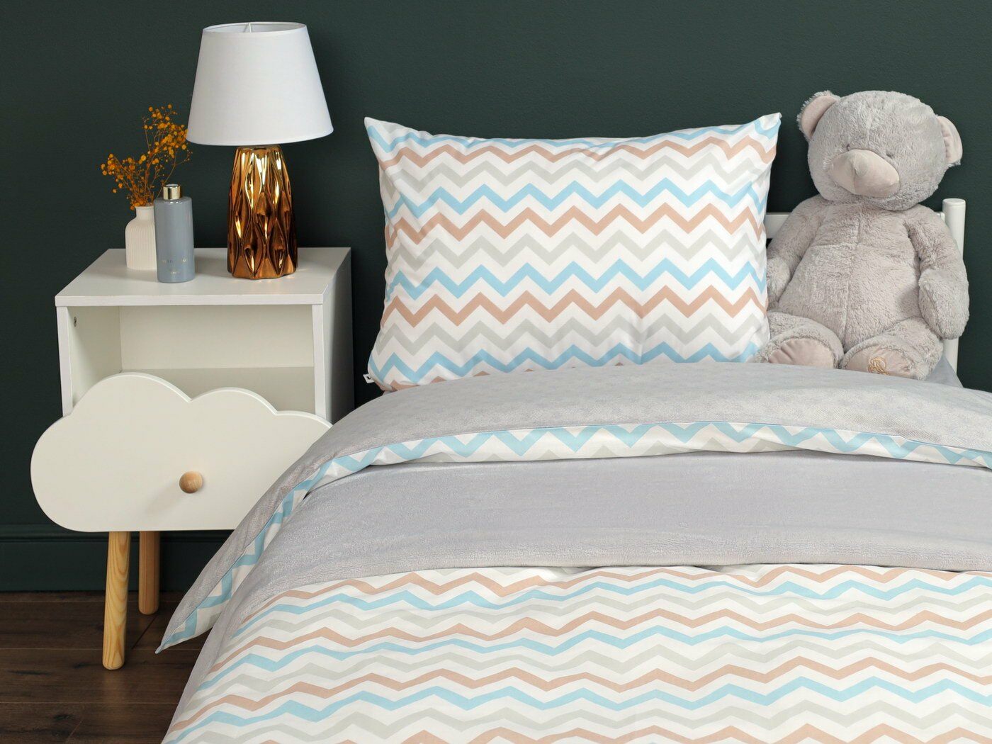 Пододеяльник –двусторонний: верх из ткани А (принтованная ткань), обратка из ткани В (однотонная рогожка), с потайной молнией.