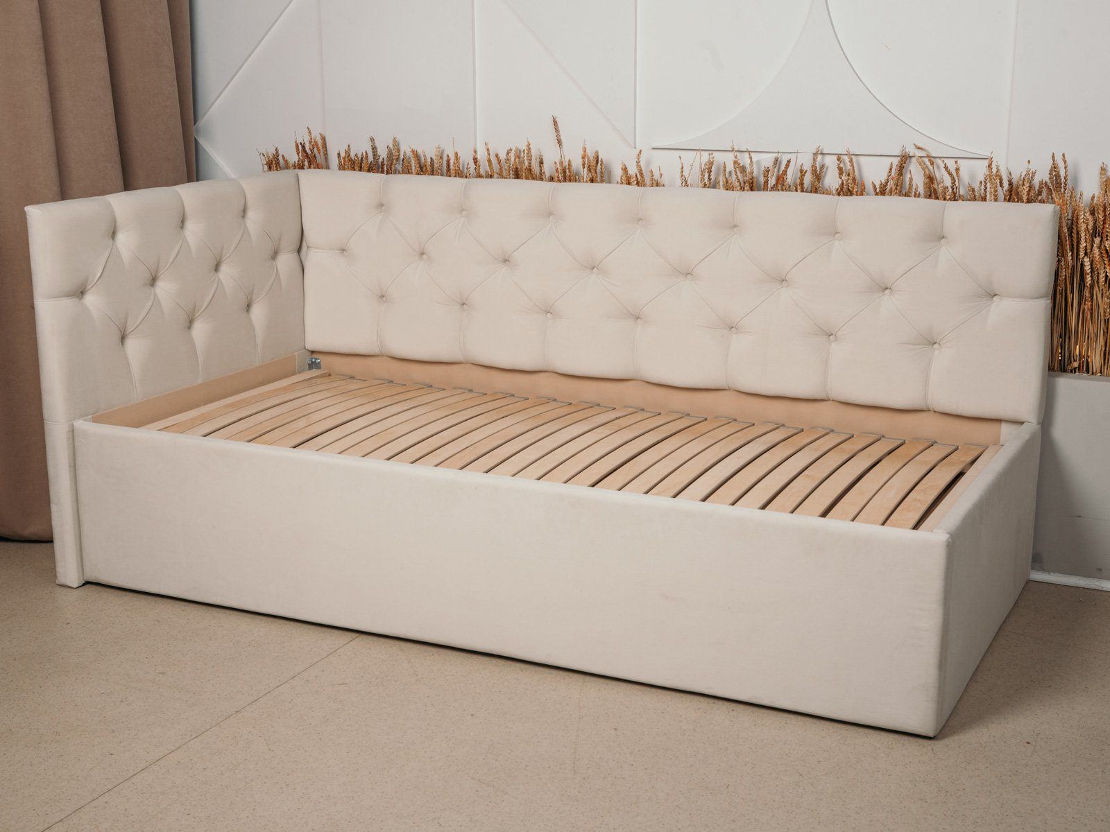 В комплектации с подъемным механизмом кровать имеет вместительный бельевой короб с двумя отделениями.