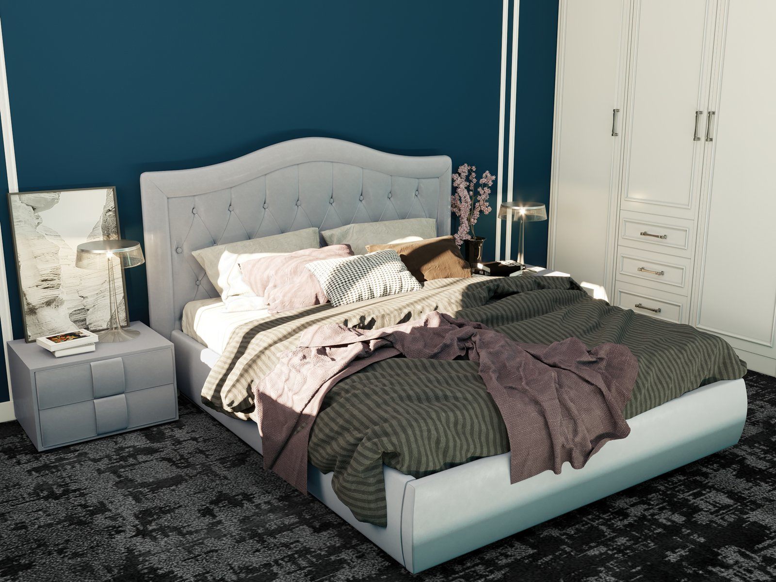 Кровать Эридан выделяется своей утончённостью и плавностью линий. Высокое волнообразное изголовье выполнено с техникой каретной стяжки и декоративной отделкой пуговицами, придает кровати особенную нежность, грациозность и выразительность.