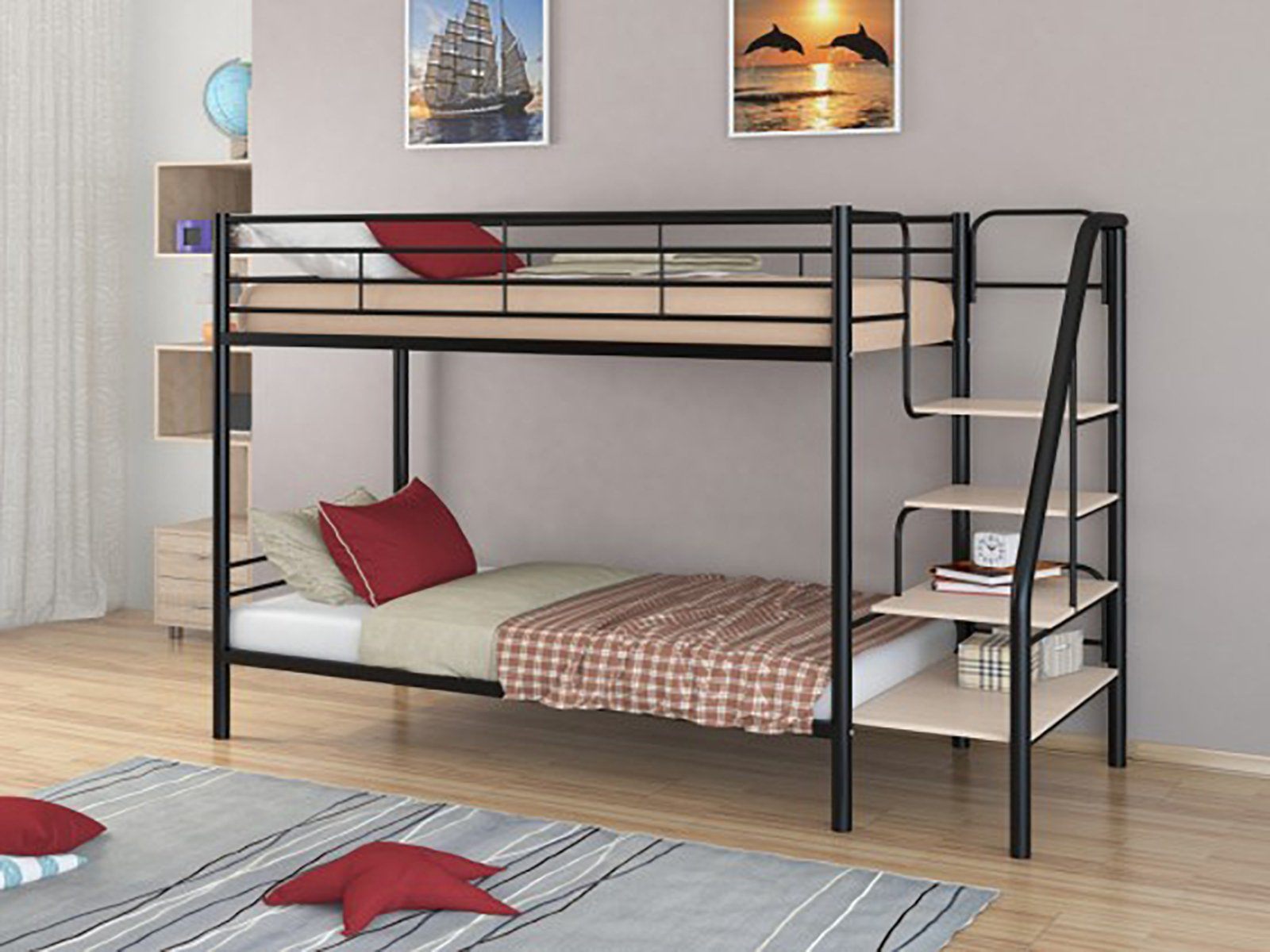 Все металлические элементы кровати покрыты износоустойчивой краской без запаха. Двухъярусную кровать можно собирать и разбирать неограниченное количество раз, и от этого она не потеряет в прочности и качестве.