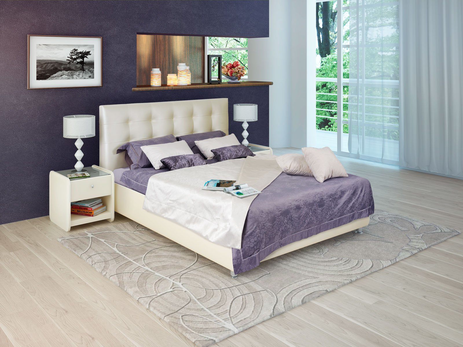 Современная модель среди интерьерных кроватей. Оригинальный рельеф изголовья, выполненный в виде квадратов с декоративной строчкой задает определенный ритм всему интерьеру спальни.