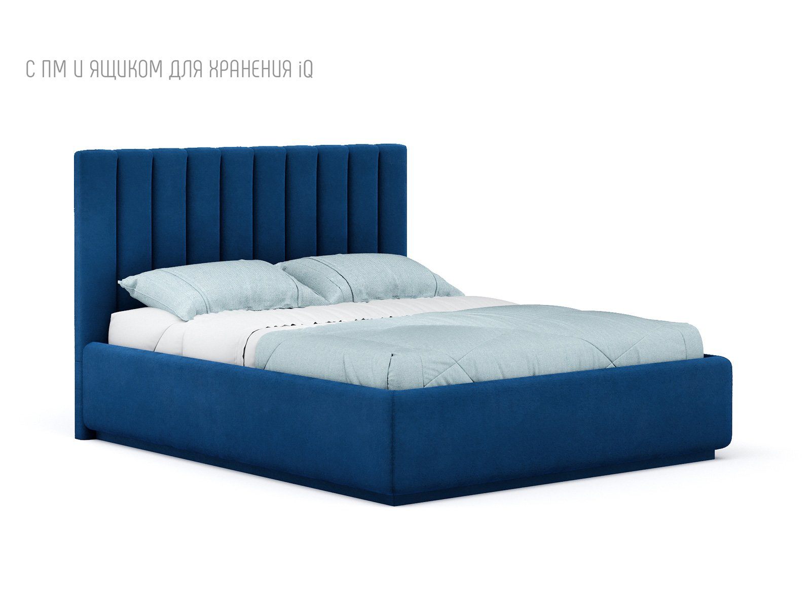 Кровать укомплектована IQ с подъемным механизмом и ящиком для белья без дна (дополнительная платная опция - дно к ящику IQ из HDF (ХДФ). Каркас кровати на цоколе, декоративный чехол на цоколе съёмный. Глубина ящика для белья - 30 см, без ограничения нагрузки на ящик.