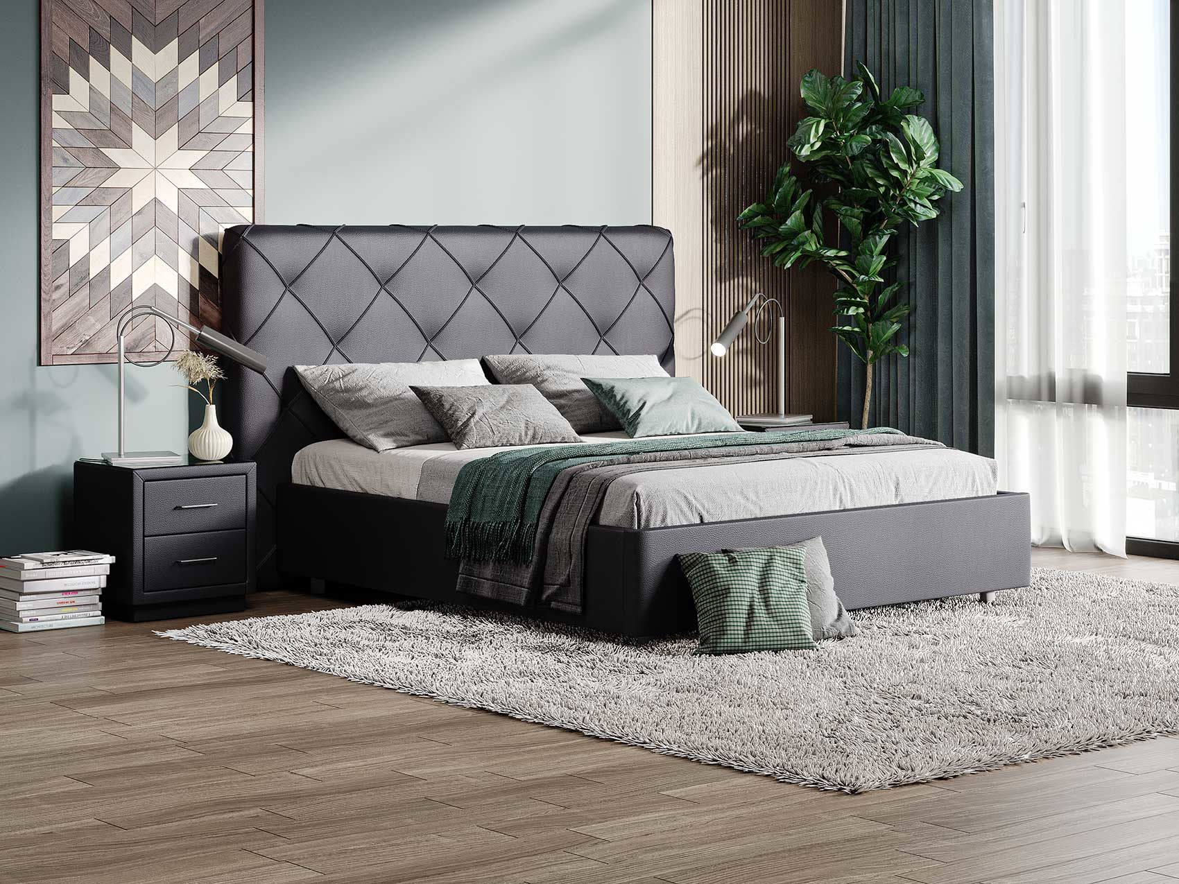 Современная интерьерная кровать. При необходимости, возможно установить подъемный механизм с бельевым ящиком. Ножная царга кровати скругленная по углам, что обеспечивает более элегантный внешний вид.