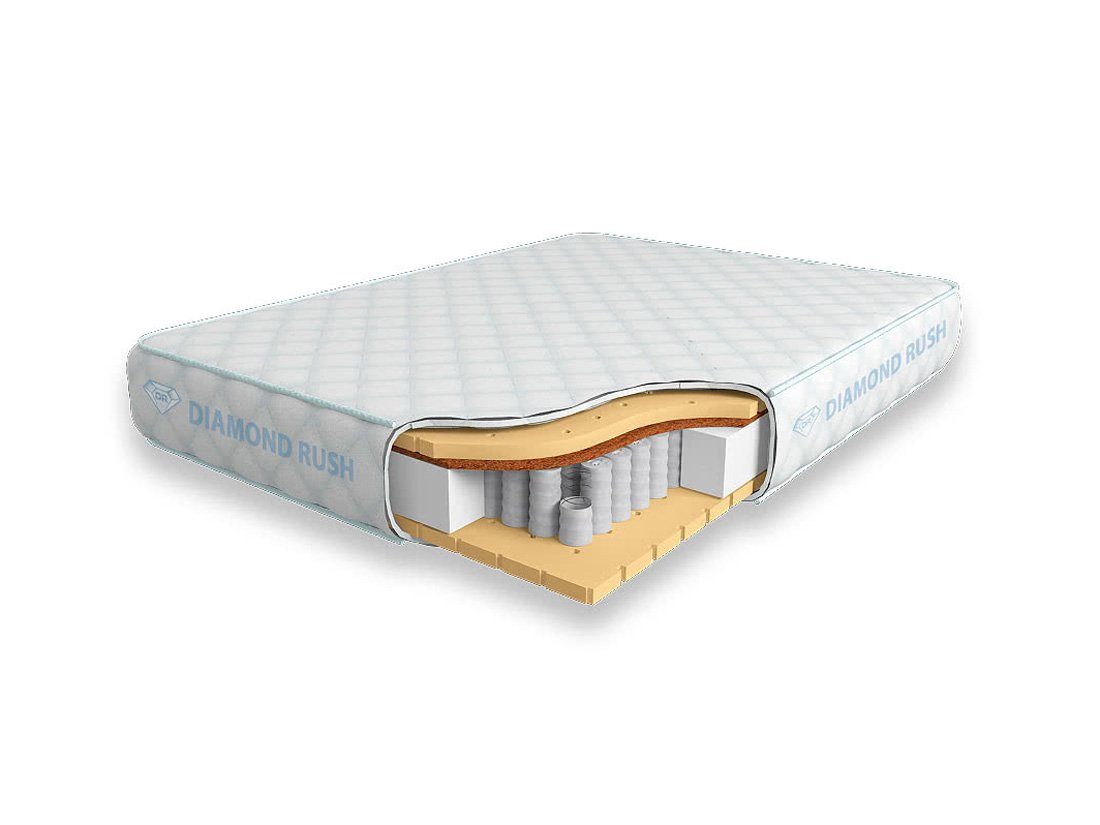 Матрас Diamond Rush Comfy Contrast 725DR имеет в своей основе независимый пружинный блок 725, состоящий из пружин диаметром 5-6 см. В качестве настилочных слоев поверх пружинного блока используются листовой натуральный латекс с перфорацией и латексированная кокосовая койра. Стороны матраса различаются по жесткости. Одна сторона мягкая, другая среднежесткая.