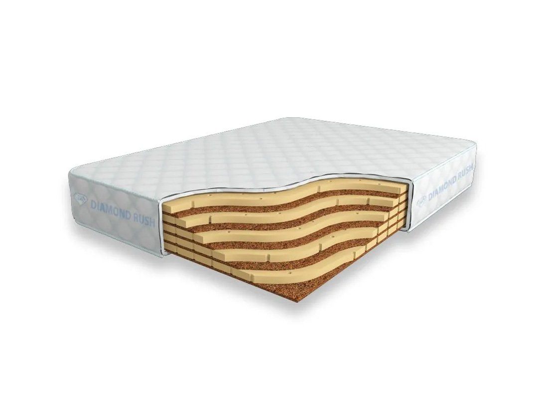 Матрас Diamond Rush Mix Cocos 20 DR является беспружинным, т.е. не имеет в своей основе пружинного блока. В его состав входят чередования слоев латексированной кокосовой койры (1см) и натурального латекса с перфорацией (3см). Эта модель имеет разные по жесткости стороны.