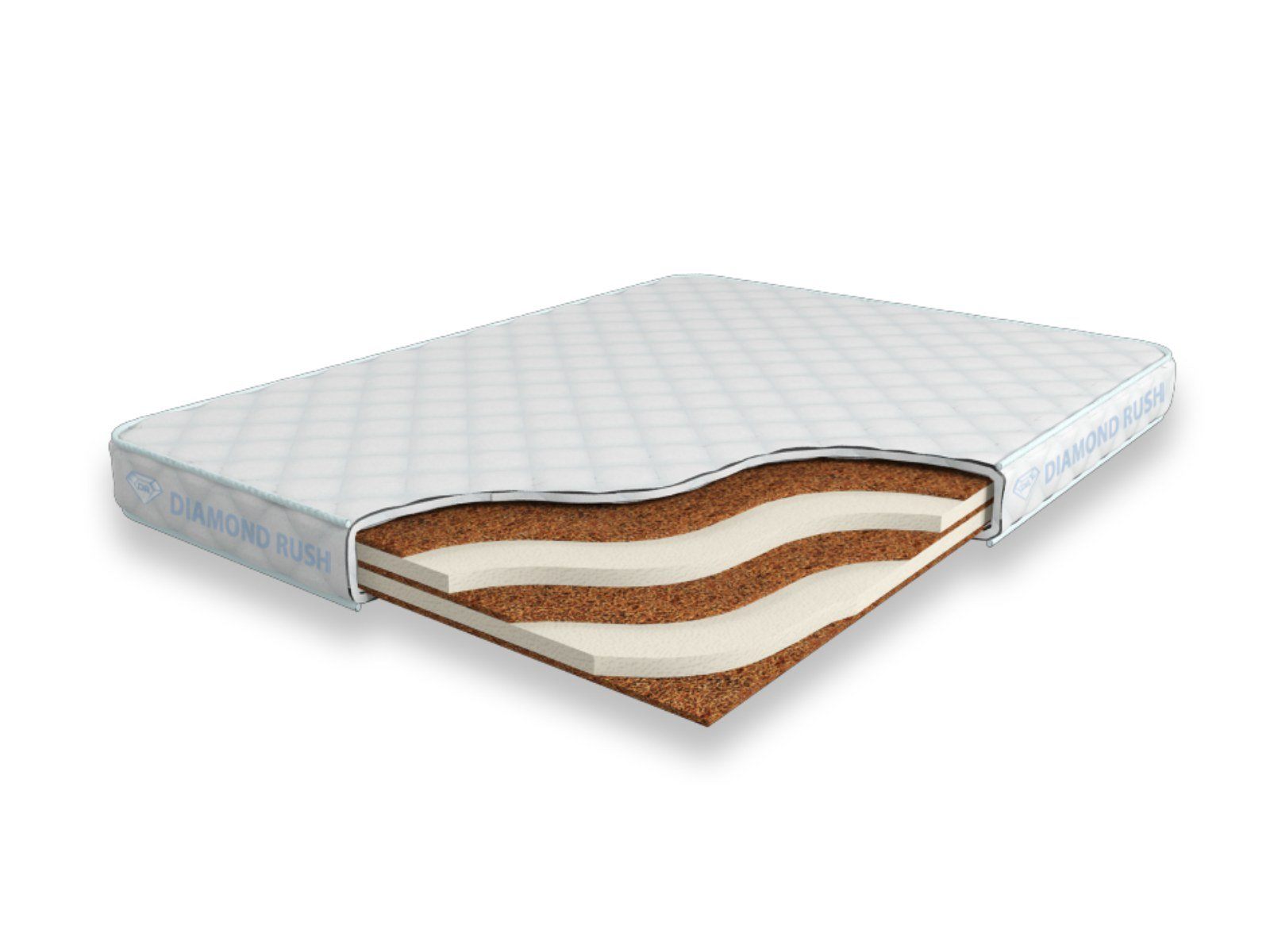 Матрас Diamond Rush Mono Mix Cocos 9 SD является беспружинным, т.е. не имеет в своей основе пружинного блока. В его состав входят одно или несколько чередований слоев латексированной кокосовой койры (1см) и искусственного латекса (3см). Такая модель матраса относиться к среднежестким и обладает средним ортопедическим эффектом.