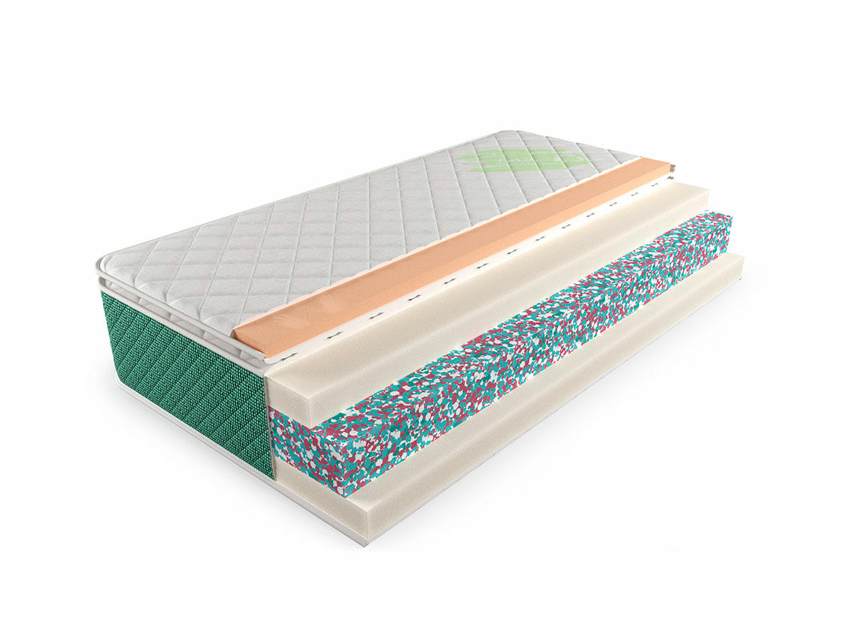 В беспружинной основе матраса блок высотой 14 см из вторичного материала - переработанного ППУ и испанской соевой пены. Наполнитель имеет повышенную плотность, износостойкость и прочность.