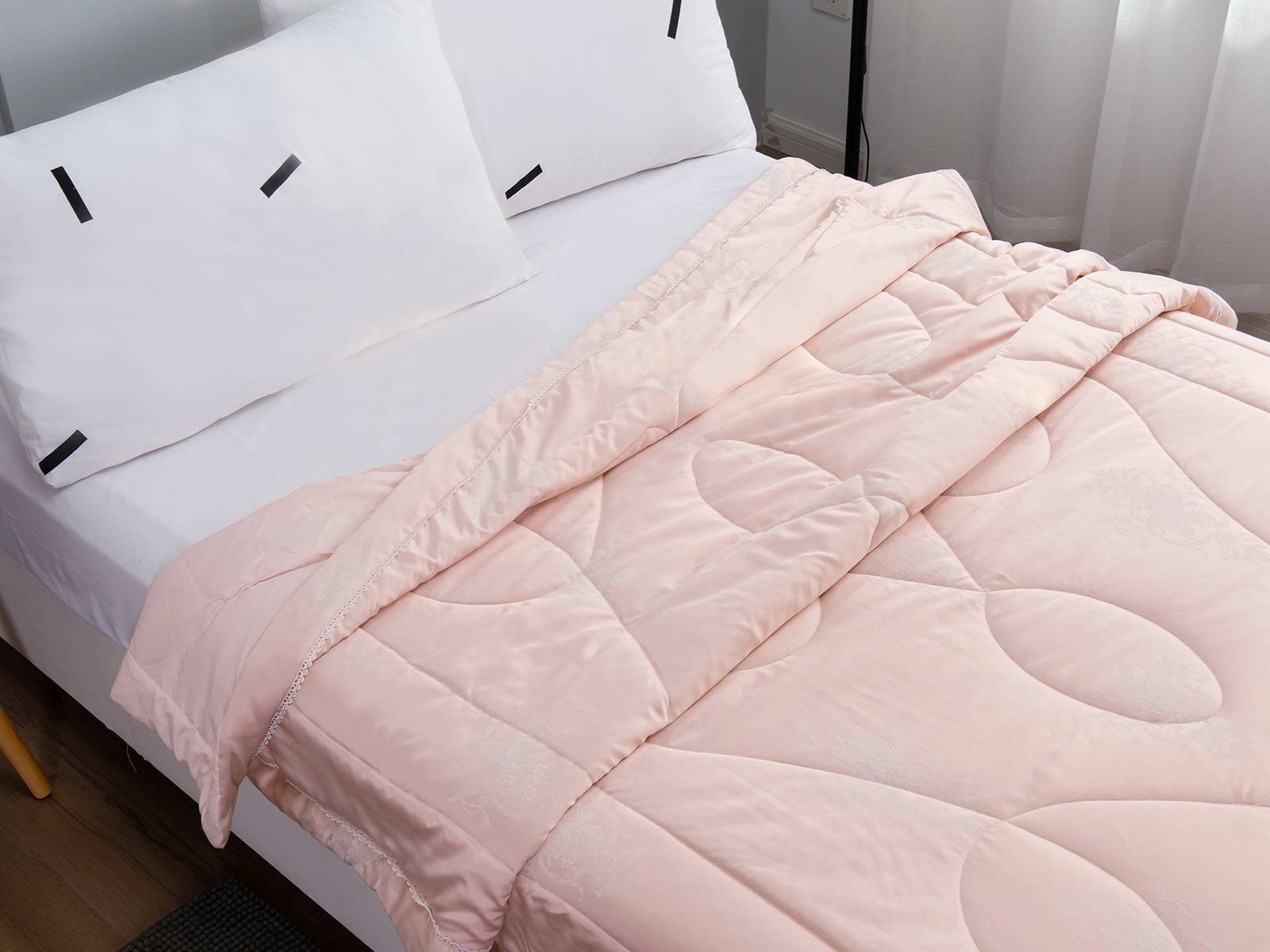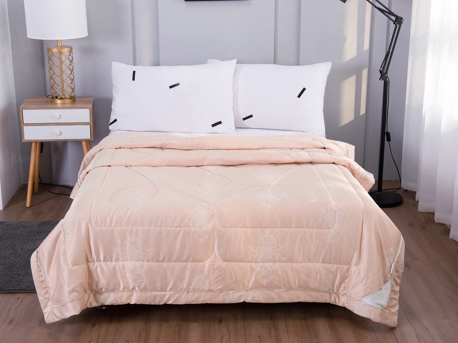 Одеяло представлено в модных цветах этого сезона: пудра, персик, крем, серый, карамель. Такие оттенки придадут нотки изысканности и утонченности вашей спальне. Изделие украшает декоративная стежка, создающая на одеяле прямые, изогнутые линии и окружности. С помощью специального станка на ткань нанесен уникальный повторяющийся рисунок в винтажном стиле. Вы можете выбрать узор на свой вкус: небольшой лавровый венок, венчающий корону, или одну из цветочных композиций среднего размера. По широкому канту в тон изделию проходит деликатная полоска светлого кружева.